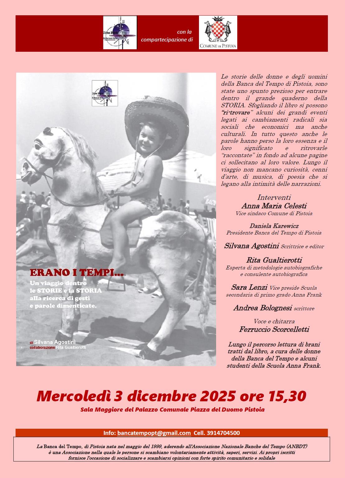 L'evento è a cura della Banca del Tempo di Pistoia, associazione in cui le persone si scambiano volontariamente attività, saperi e servizi, offrendo ai propri iscritti l’opportunità di socializzare e condividere opinioni, con un forte spirito comunitario e solidale