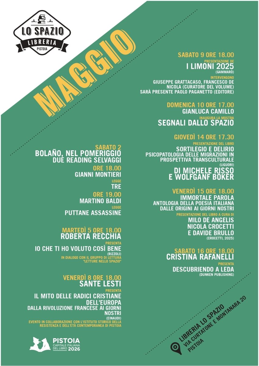 Un mese di eventi alla Libreria Lo Spazio che sarà presente anche al Festival Dialoghi di Pistoia, in piazza del Duomo, dal 22 al 24 maggio 2026