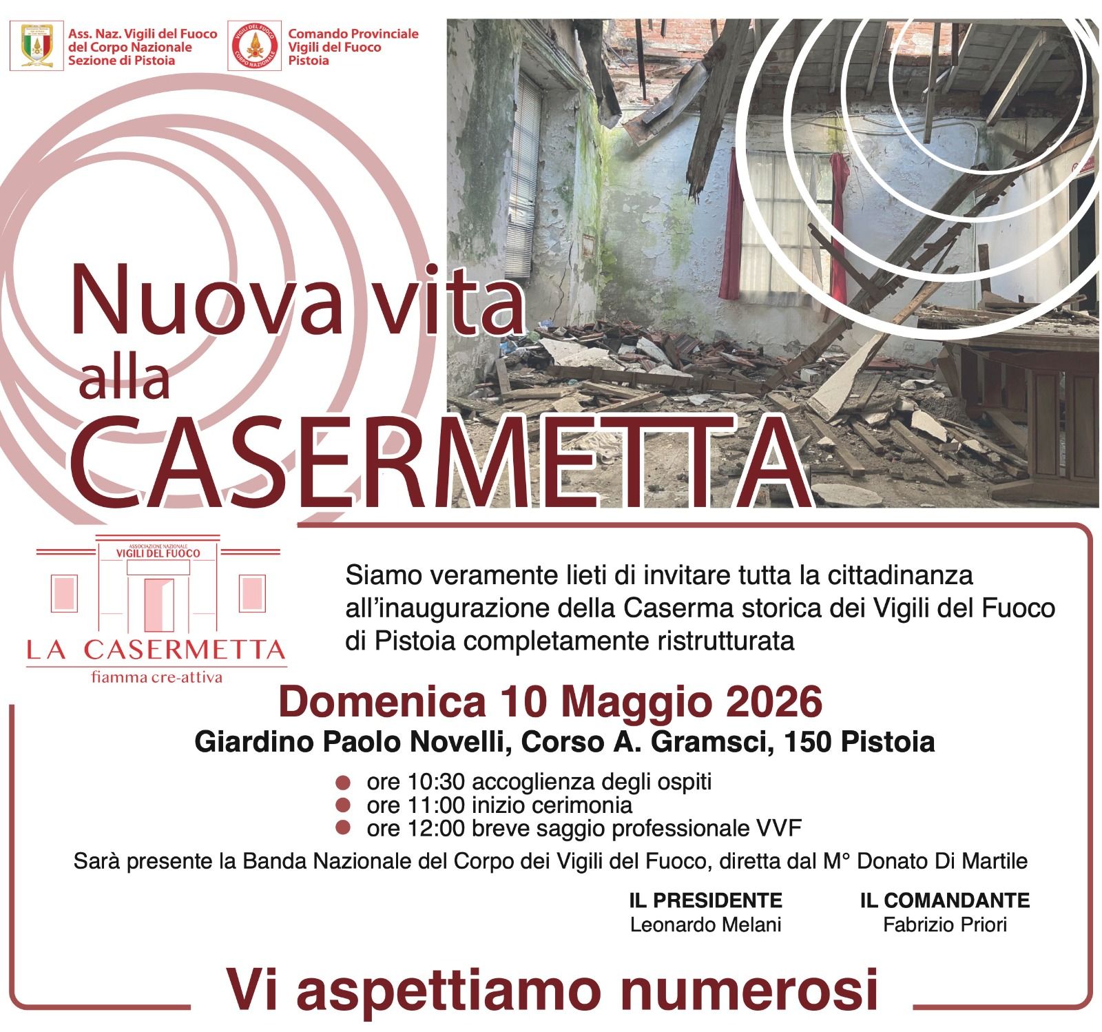 L'associazione nazionale dei Vigili del Fuoco ODV, Sezione proivinciale di Pistoia inaugura la nuova "CASERMETTA" dei Vigili del Fuoco, in Corso Gramsci nella sede della storica Caserma dei Vigili del Fuoco, ora ristrutturata.