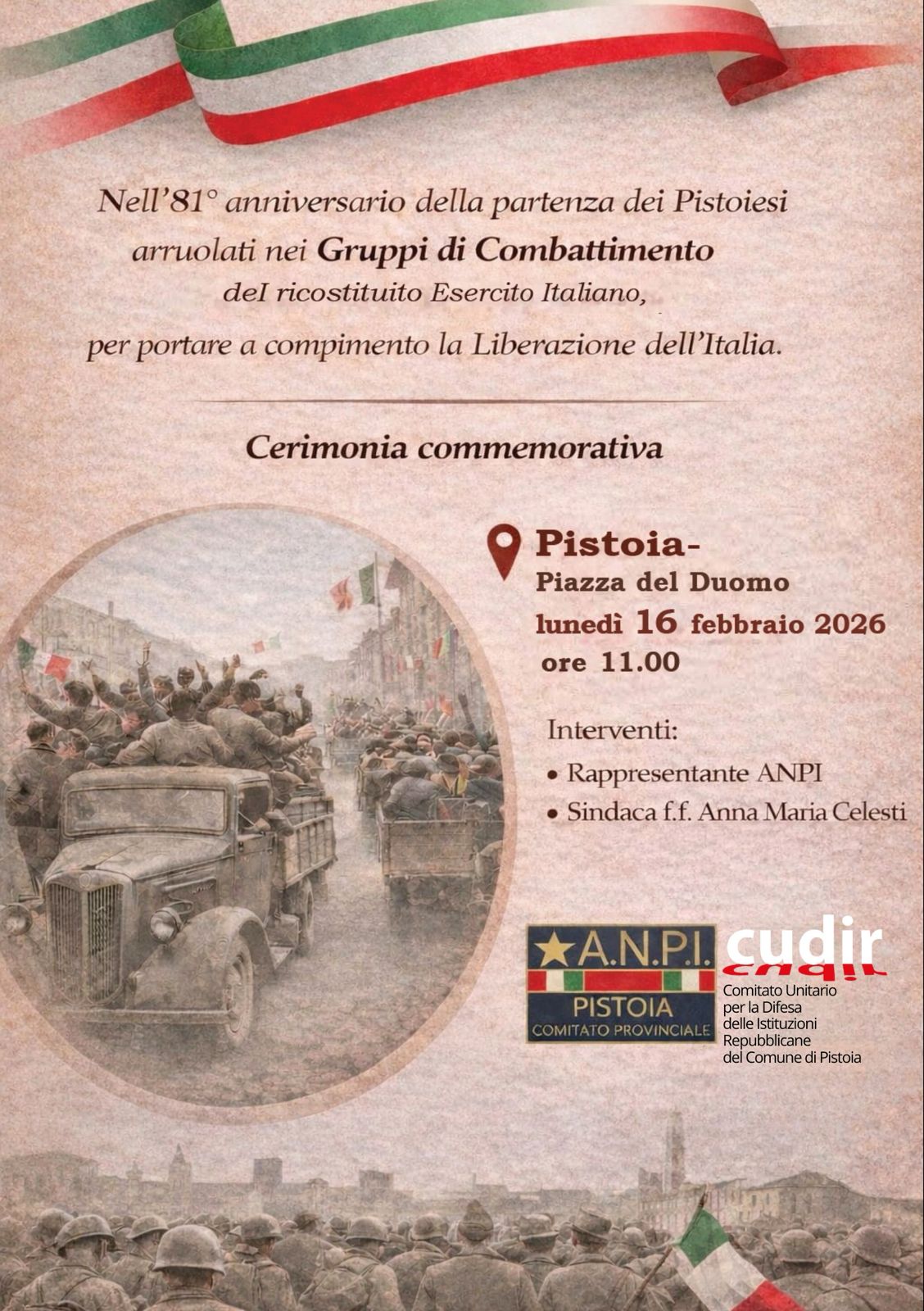 Cerimonia in ricordo della partenza di 500 giovani pistoiesi arruolati nei Gruppo di Combattimento del rinato Esercito Italiano per portare a compimento la Liberazione dell'Italia