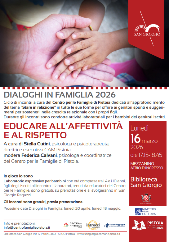 Ciclo di incontri a cura del Centro per le Famiglie di Pistoia dedicati ai genitori. Durante gli incontri sono proposti laboratori per i bambini e le bambine dei genitori partecipanti