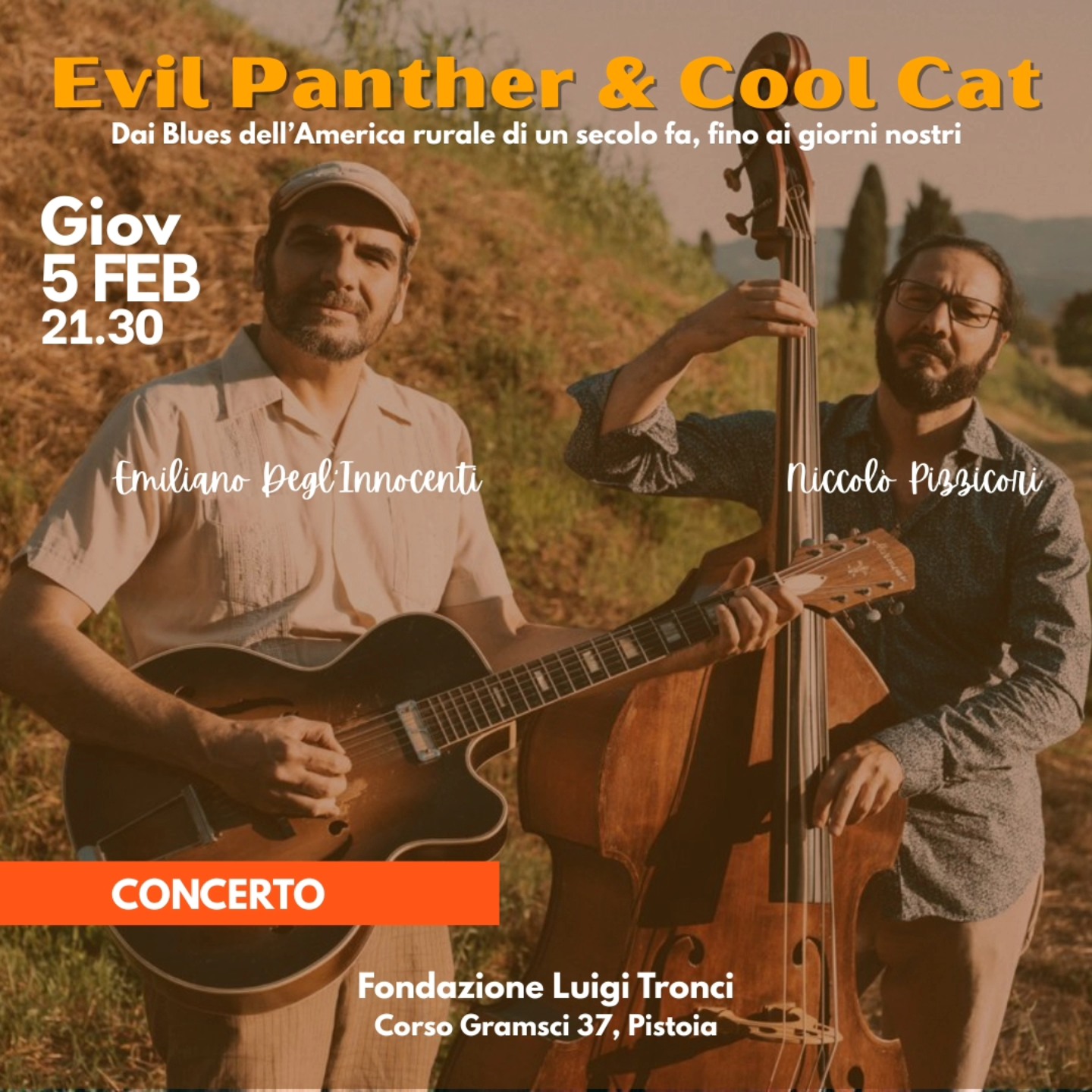 Dal Blues delle origine alle influenze più contemporanee con il concerto di Evil Panther & Cool Cat: chitarra e voce di Emiliano Degli'Innocenti, contrabbasso e voce di Niccolò Pizzicori per una serata dedicata a chi ama il blues o lo vuole scoprire nella sua più pura autenticità