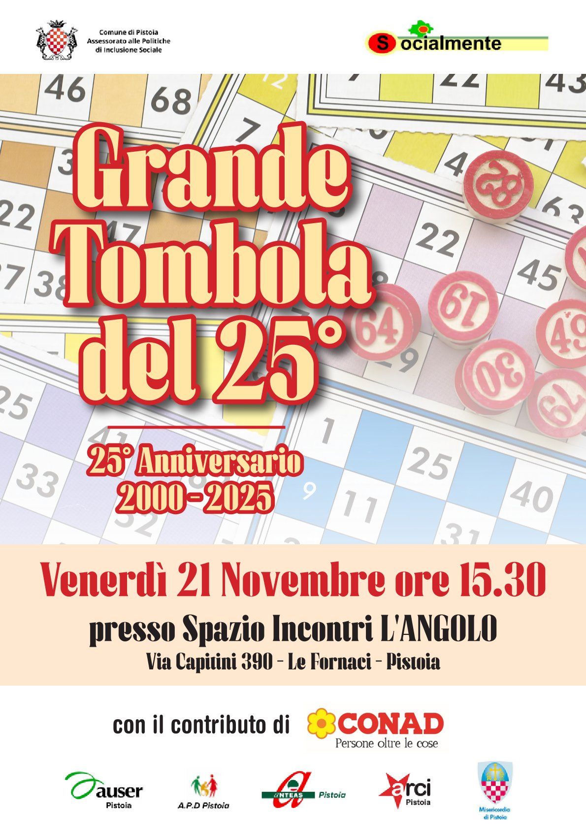 Presso lo spazio incontri "L'Angolo" si svolgerà la Grande Tombola del 25°, uno degli eventi organizzati nell'ambito di "Socialmente", il progetto del Comune di Pistoia dedicato alla terza età.  Sarà l'occasione per stare in compagnia, divertirsi e assaggiare una gustusa merenda