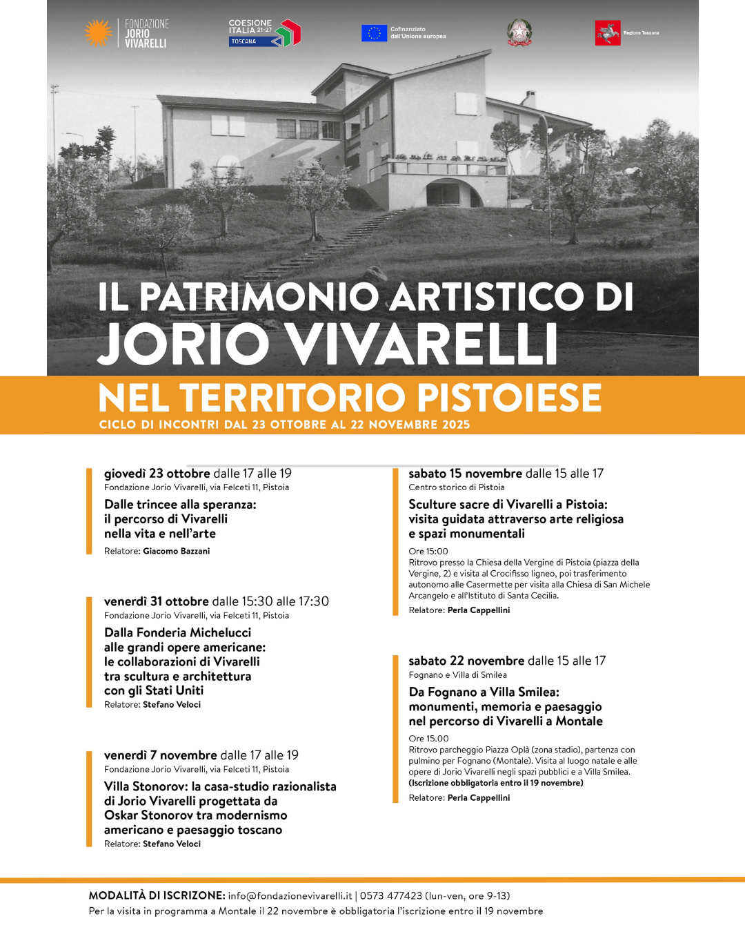 Le conferenze a cura di 𝐆𝐢𝐚𝐜𝐨𝐦𝐨 𝐁𝐚𝐳𝐳𝐚𝐧𝐢, 𝐒𝐭𝐞𝐟𝐚𝐧𝐨 𝐕𝐞𝐥𝐨𝐜𝐢 𝐞 𝐏𝐞𝐫𝐥𝐚 𝐂𝐚𝐩𝐩𝐞𝐥𝐥𝐢𝐧𝐢, accompagneranno il pubblico tra racconti, approfondimenti e visite guidate, dalla casa-studio di Vivarelli alle sculture sacre nel centro di Pistoia, fino ai luoghi simbolo di Montale.