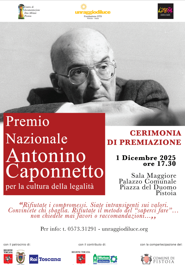XIII edizione del Premio Caponnetto istituito il 6 dicembre 2011, organizzato dalla Fondazione Un Raggio di Luce ETS, dal Centro di Documentazione e di Progetto “Don Lorenzo Milani” di Pistoia e dal Coordinamento di Pistoia di “Libera. Associazioni, nomi e numeri contro le mafie” con il contributo del Consiglio Regionale della Toscana e di Mutua Alta Toscana ETS, la compartecipazione del Comune di Pistoia e il patrocinio della Regione Toscana, della Provincia di Pistoia e di RAI Toscana.
