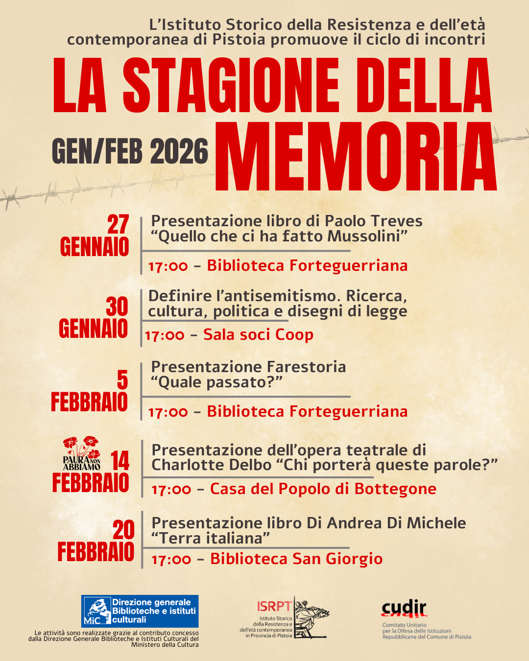 Il ciclo è a cura dell’Istituto Storico della Resistenza di Pistoia in collaborazione con Fondazione Valore Lavoro con il contributo del MIC e il patriocinio del Cudir del Comune di Pistoia.  Le iniziative fanno parte del programma di Pistoia capitale del libro 2026